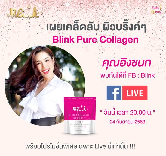 วันนี้คุณอิ๊ง อิงชนก จะมาไลฟ์บอกต่อเคล็ดลับผิวสวยแบบจัดเต็ม ไม่มีกั๊ก พร้อมจัดหนักโปรโมชั่นเฉพาะในไลฟ์เท่านั้นค่ะ Blink Pure Collagen ดื่มทุกวัน บริ๊งค์ทุกวัน ดื่ม Blink ทุกวัน ผิวสวย ดูอ่อนเยาว์